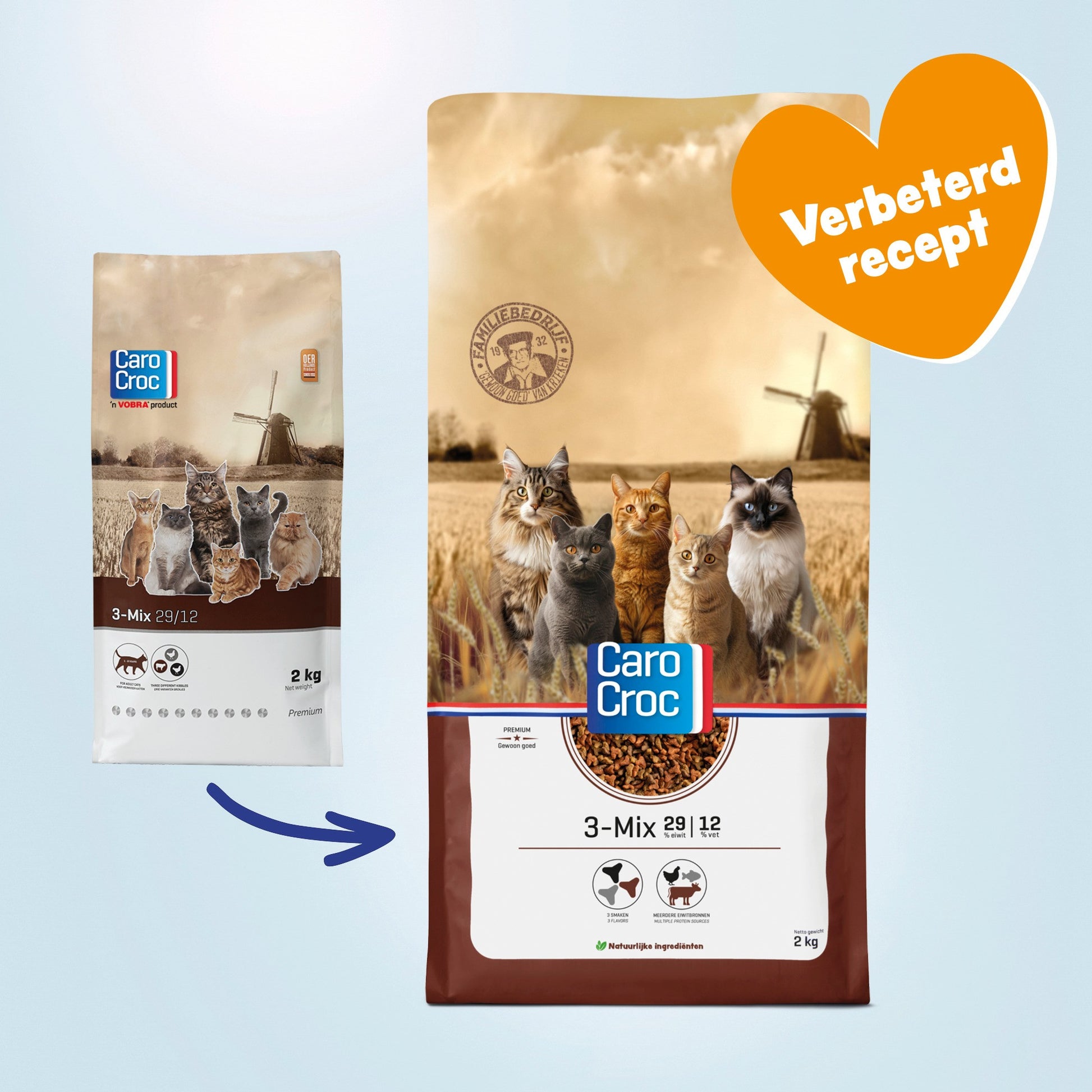 CaroCroc 3-mix 29/12 is een complete voeding voor volwassen katten van alle rassen. Deze smakelijke voeding bevat drie soorten brokjes met elk een eigen kleur. Twee brokjes hebben de smaak van gevogelte en één brokje de smaak van rund.