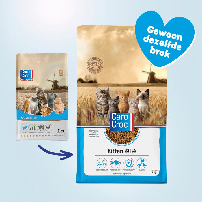 Vanaf de geboorte tot 12 maanden ontwikkelt uw kitten zich volop. Het beenderstelsel, tanden, spieren en het verteringsstelsel worden gevormd. Daarom is een goede voeding juist in deze levensfase cruciaal voor een gezond en vitaal kattenleven. CaroCroc Kitten 33/19 is een compleet voer voor kittens van alle rassen.