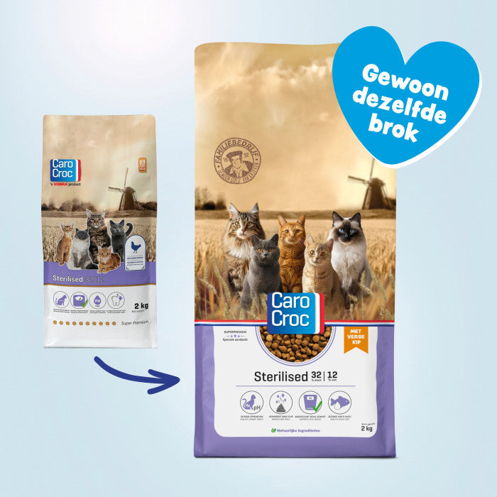 De CaroCroc Sterilised brokken zijn speciaal samengesteld voor gecastreerde en gesteriliseerde katten vanaf 6 maanden. De brokken kennen een lager eiwit- en vetgehalte, aangepast op de verlaagde energiebehoefte van de kat. Tevens zorgt de samenstelling voor een schoon gebit, een goede gemoedstoestand, gezonde urinewegen en zijn nare geurtjes van de ontlasting verleden tijd.