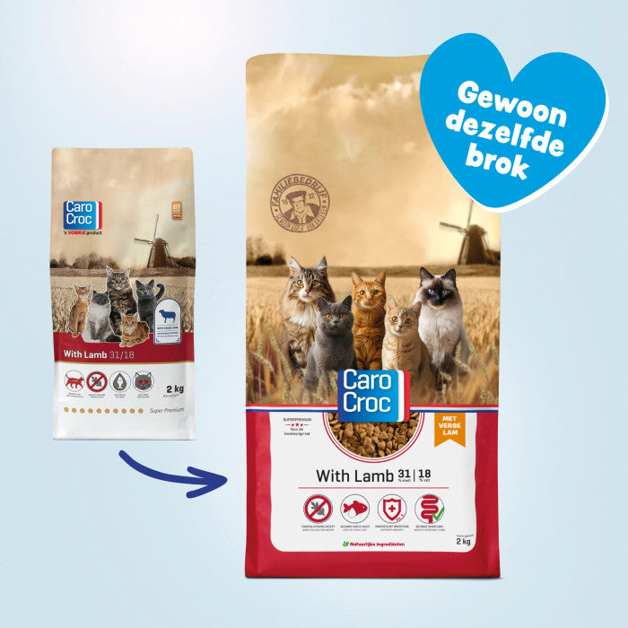 Heeft je kat een gevoelige spijsvertering, dan kan CaroCroc With Lamb 31/18 uitkomst bieden. CaroCroc With Lamb is een complete voeding met verse lam voor volwassen katten jonger dan 8 jaar en ondersteunt bij spijsverteringsproblemen. Door het hoge aandeel lam (11%) is het nog lichter verteerbaar.