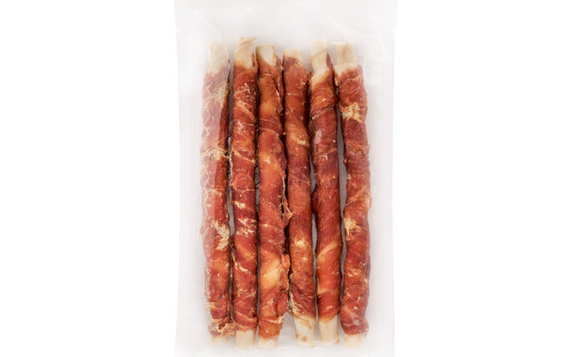 Gedraaide kauwstaaf van runderhuid, omwikkeld met eendfilet
